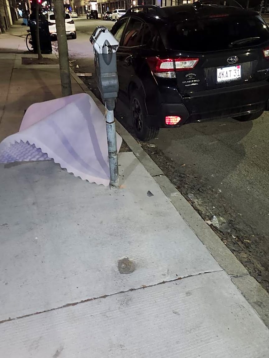 Noted. Foam mattress found dumped on sidewalk no evidence found unable to issue citation sent to dpw for removal.