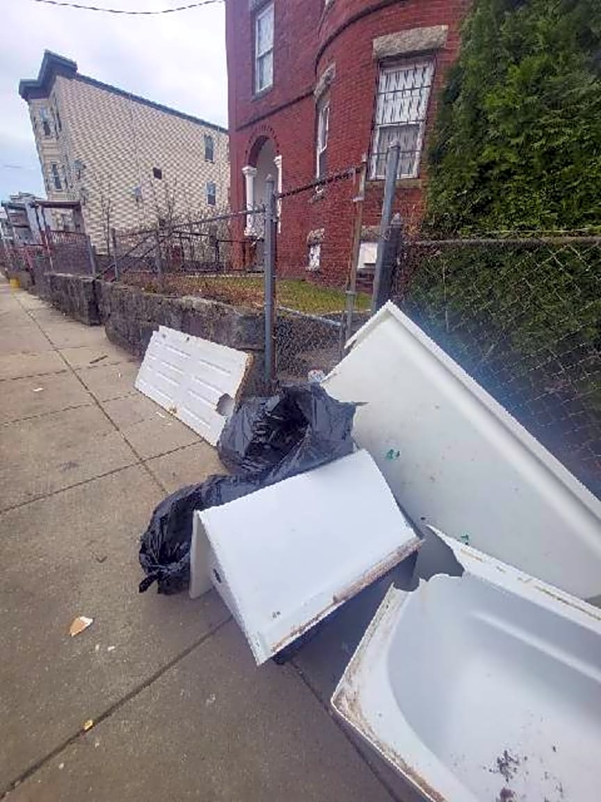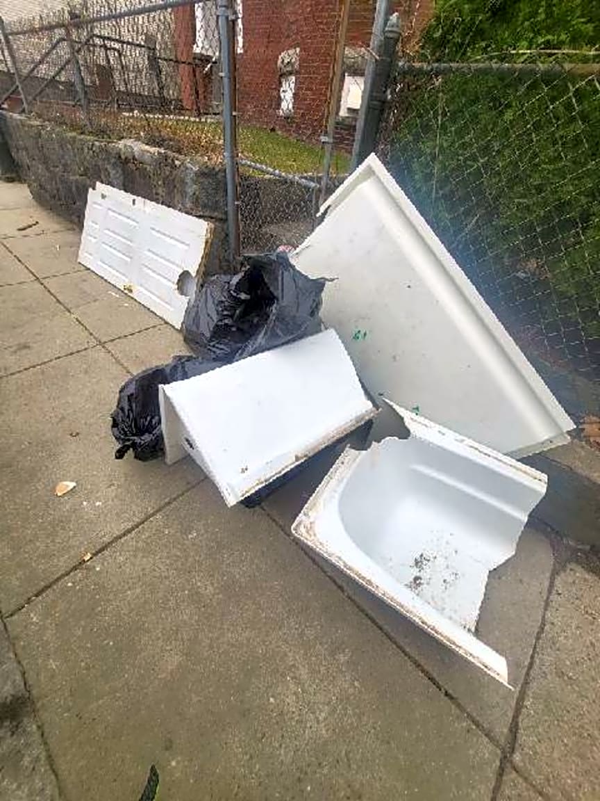 - Emptied barrels left out on sidewalk | Details: [empty barrels, doors, tiles and other construcution items. Pushing up to neighbors property but coming from this address. Have been here for at least 2 weeks now.] Exact location: [front]