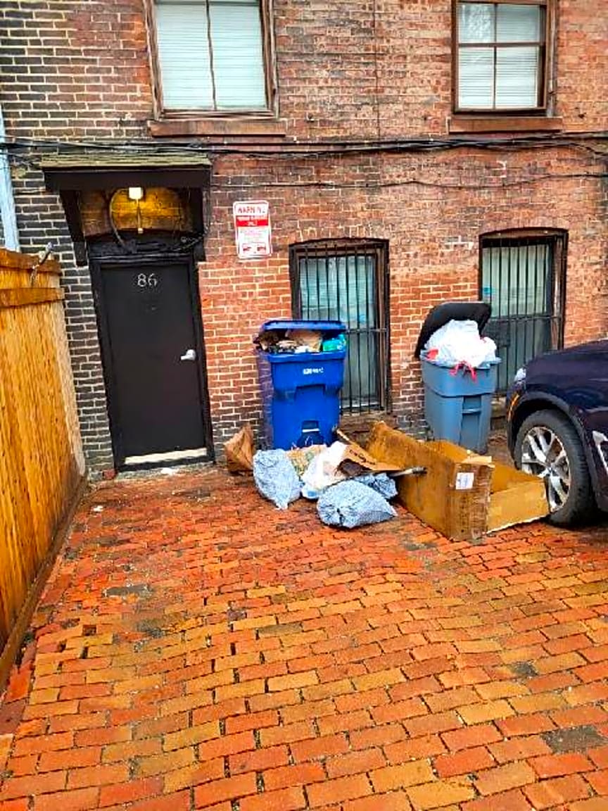 - Trash overflowing and attracting rats. Also blocking entrance to building. FINDING THE ADDRESS: Address is 86 Charles Street, but the trash bins are located in the BACK of the building on Mt Vernon Sq in Public Alley 301, in between 6 Mt Vernon Sq and 10 Mt Vernon Sq. You will see the trash cans and a black door with "86" on it. NOTE: New owners took over in November. This building is now owned by CEI Realty, LLC at 101 Federal St, Unit 1900, 02110.it is managed by Suffolk Property Management. __ ISSUE: Ongoing issue with landlord refusing to manage trash properly. It is stored illegally next to resident windows and is constantly overflowing attracting rats, smells, mice, and flies. Past and current landlords refused to address it for past 4 years despite being apprised in writing of the CMR 410s they are in violation of.