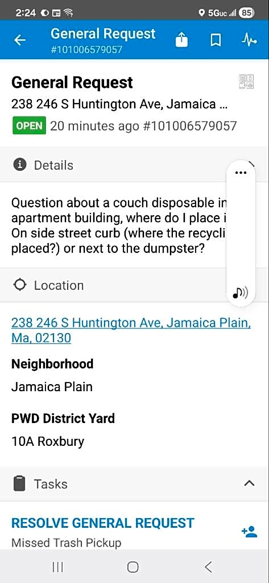 Noted. Place the couch next to the dumpster to be serviced. Today 3/23/26.