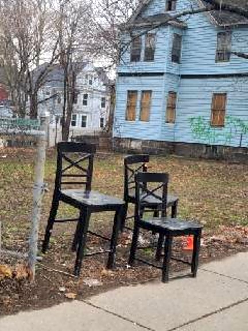 - Three chairs and a tire have been left on the sidewalk for weeks. The chairs have since been pushed onto the fence of an abandoned house. There’s also a lot of trash in the street and on the sidewalk.