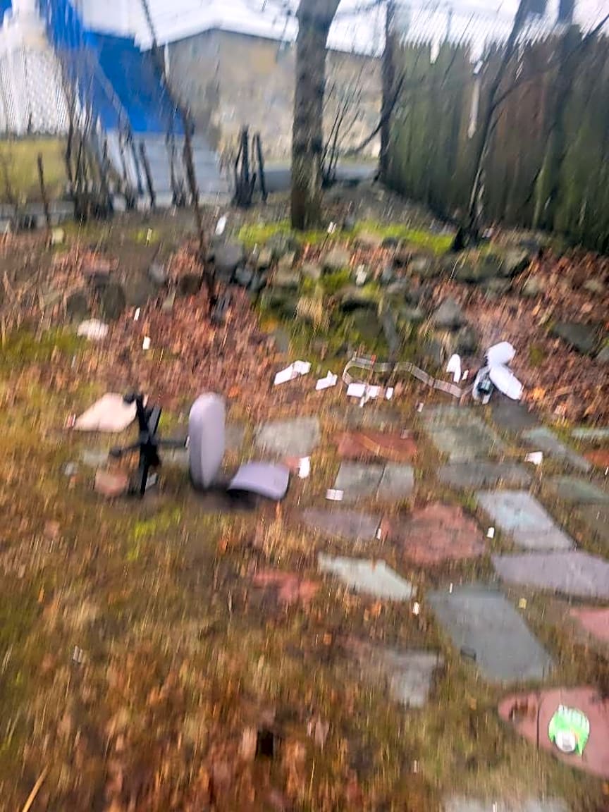- Old discarded chair/furniture dumped on back patio and improperly stored bag of trash by patio door