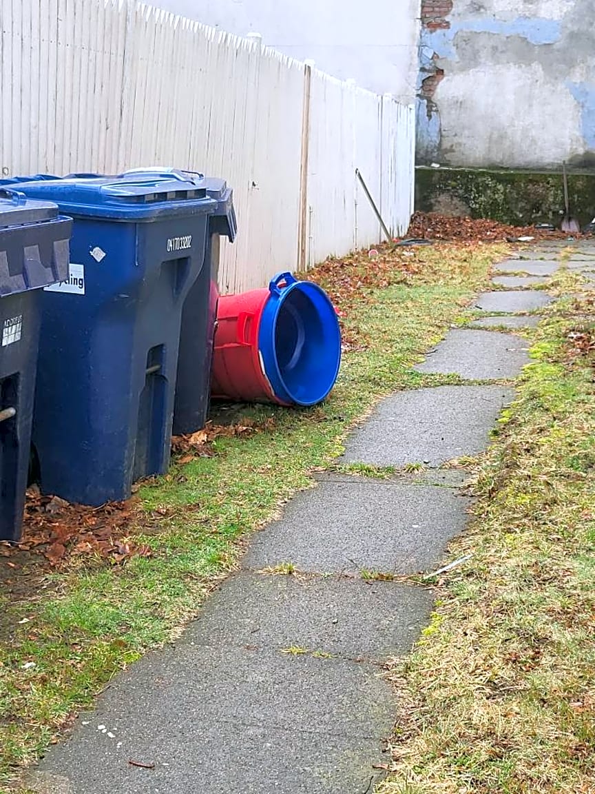 - Red plastic cups and other litter around back of house