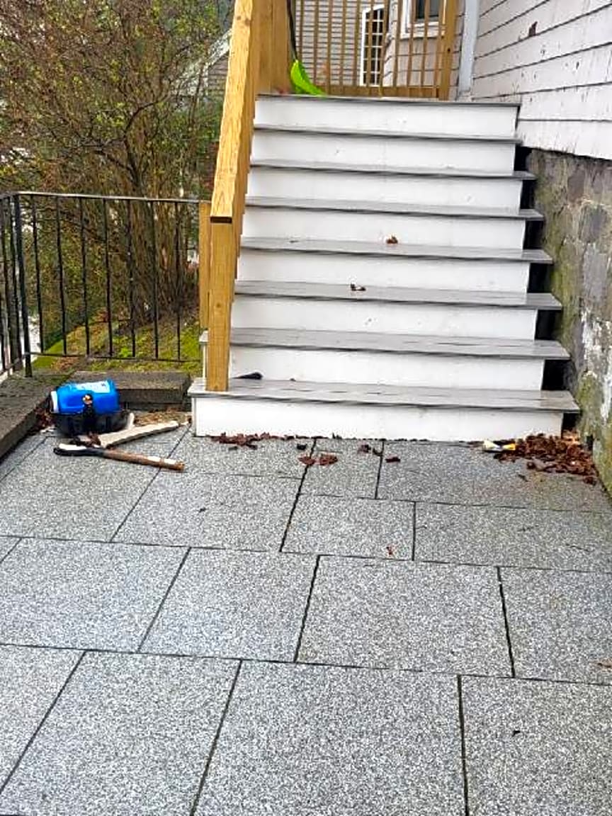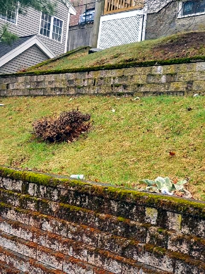 - Empty beer cans by base of big shrub in front of porch. There are also other plastic bottles on front grass by concrete wall