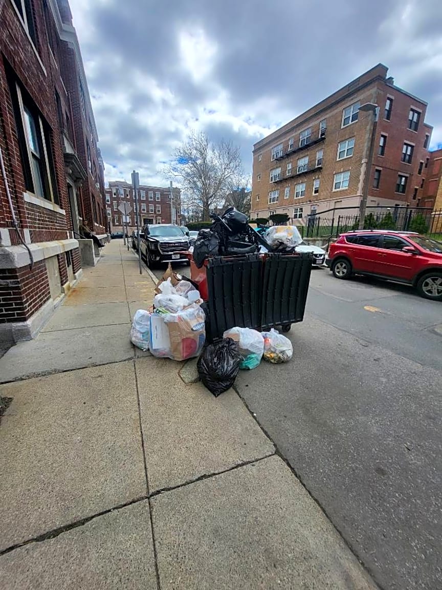 - This is an unacceptable way to put trash on the street, it’s on the sidewalk and scattered around . Please fine this company