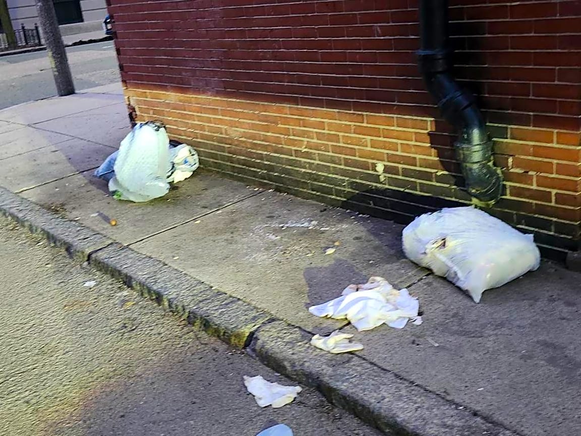 Noted. Bags found dumped in alleyway no evidence found unable to issue citation sent to dpw for removal.
