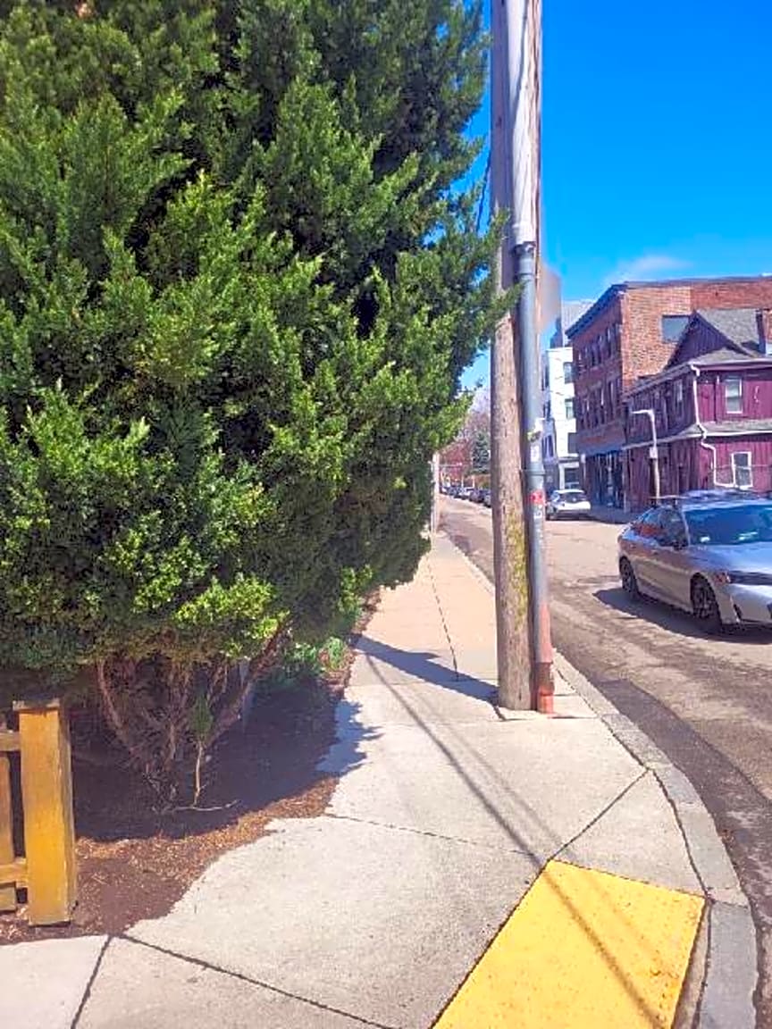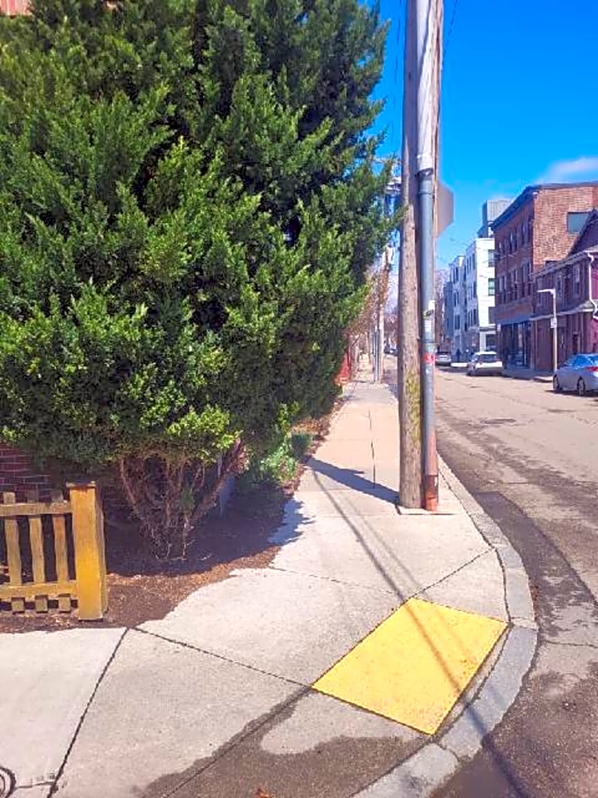 - Property conditions interfere with sidewalk passage | Details: [Originally submitted as BCS-00181056 Tree blocking sidewalk making rounding the corner difficult and dangerous. Photo link: https://bos.creatio.com/0/rest/FileService/Download/CaseFile/5f1ace47-357b-4d97-874e-48f4185f4823]