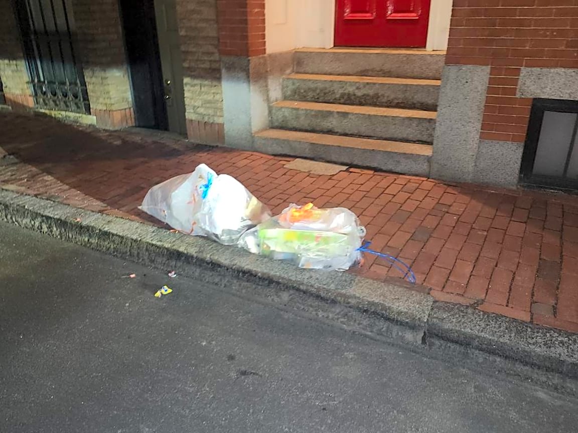 Noted. Bags found dumped on sidewalk no evidence found unable to issue citation sent to dpw for removal.