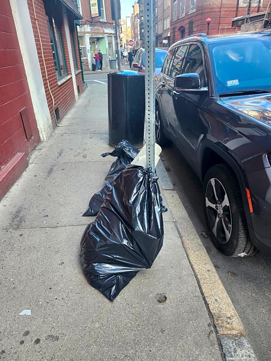 Noted. Bags found dumped on sidewalk no evidence found unable to issue citation sent to dpw for removal.