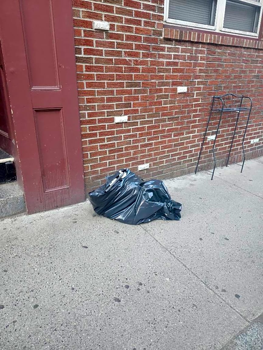 Noted. Bag found dumped on sidewalk no evidence found unable to issue citation sent to dpw for removal.