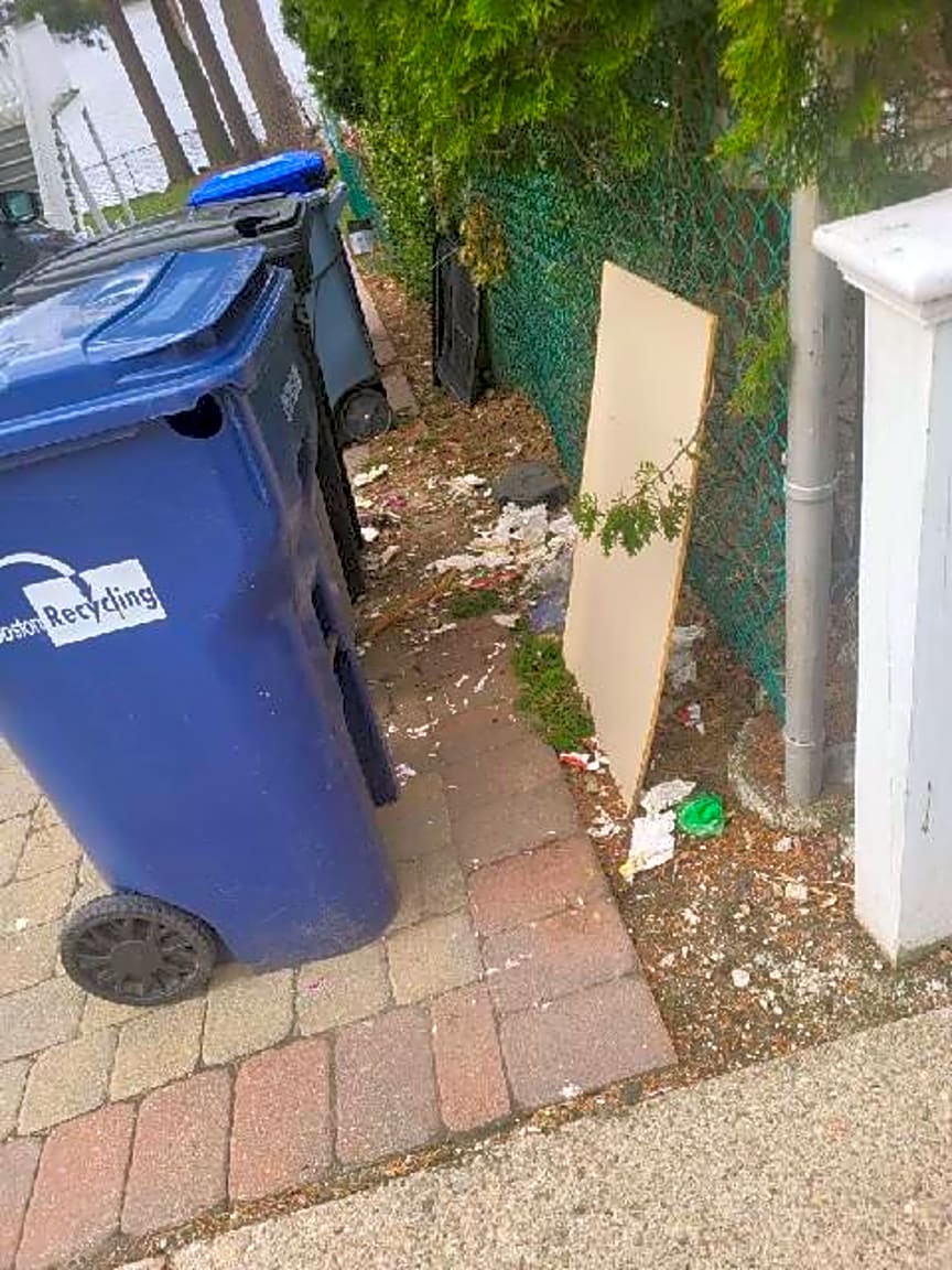 - Overflowing trash cans leading to filthy and unsanitary display of trash, strewn across driveway and sidewalk area. Rats/pests have been sighted often.