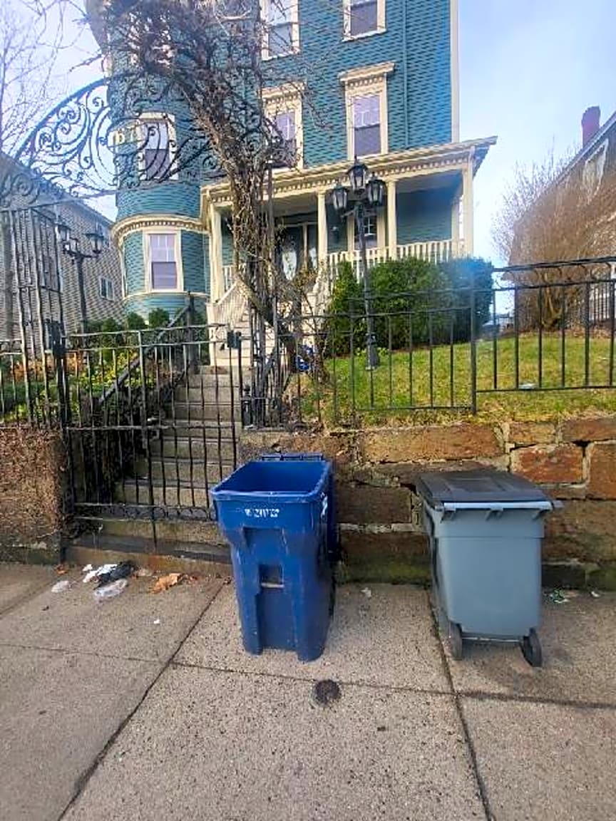 - 22 & 54b 56 b Clifford street trash barrels blocking sidewalk and once again cars parked on sidewalk.