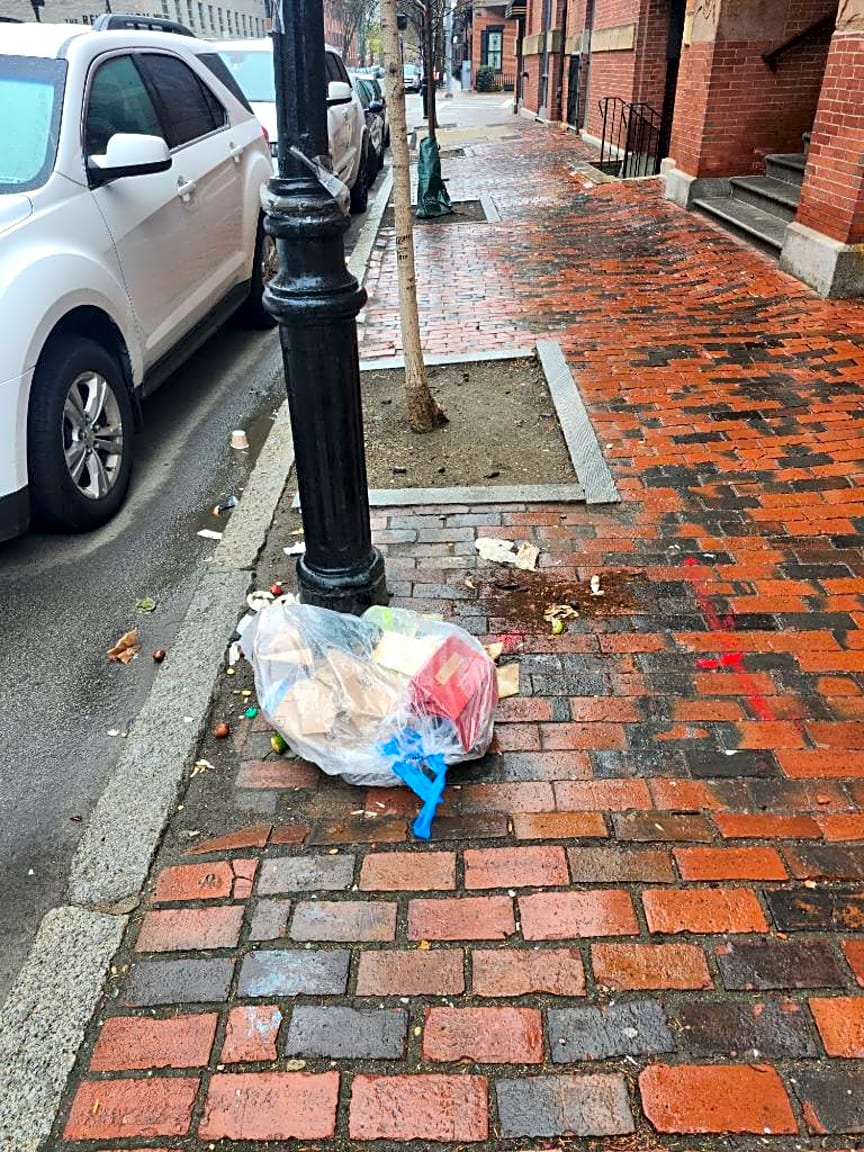 Noted. Bags found dumped on sidewalk no evidence found unable to issue citation sent to dpw for removal.