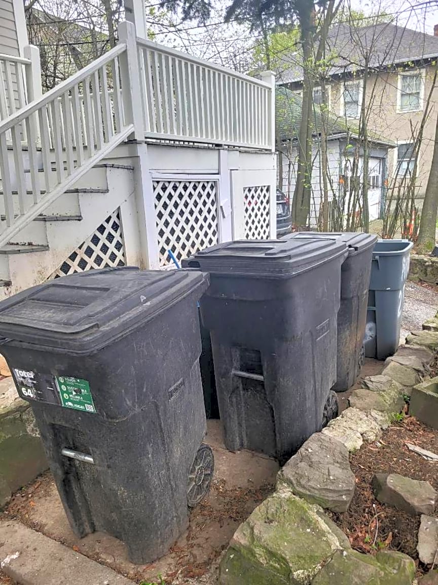 - Loose trash in between trash barrels that are stored along the Greycliff Rd side of house.
