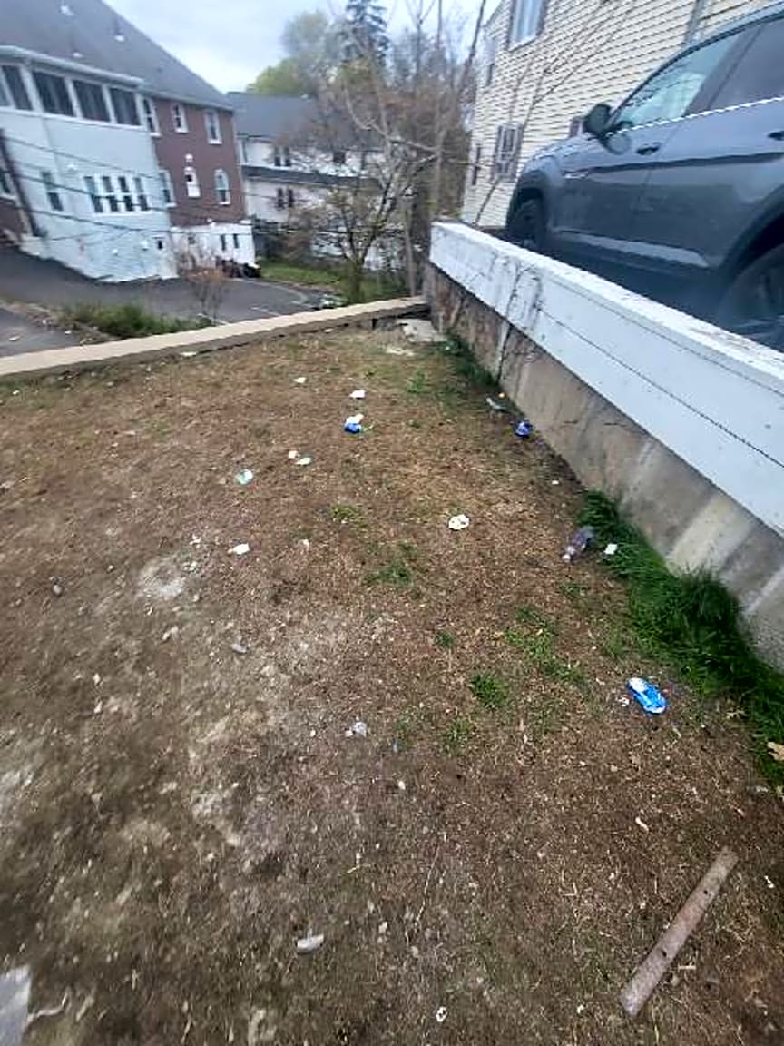- Full trash barrel not fully covered properly and loose trash in back of house