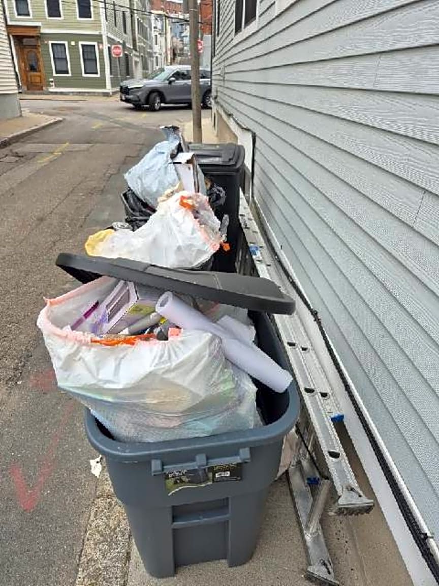 - 74 F St, Unit 1 has overflowing trash cans causing litter to accumulate into the street. Additionally, the cans are not sealed so we have see frequent rodent activity. This is an ongoing issue with 74 F St, Unit 1, please confiscate their cans. This is in the Bowen St alley that 74 F St, Unit 1 borders.