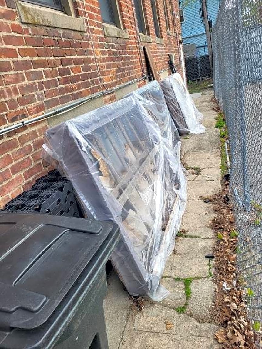 - Other | Details: [tenant moving out, has left mattresses , furniture and loose trash on side of bldg. Landlord doing nothing] Exact location: [side]