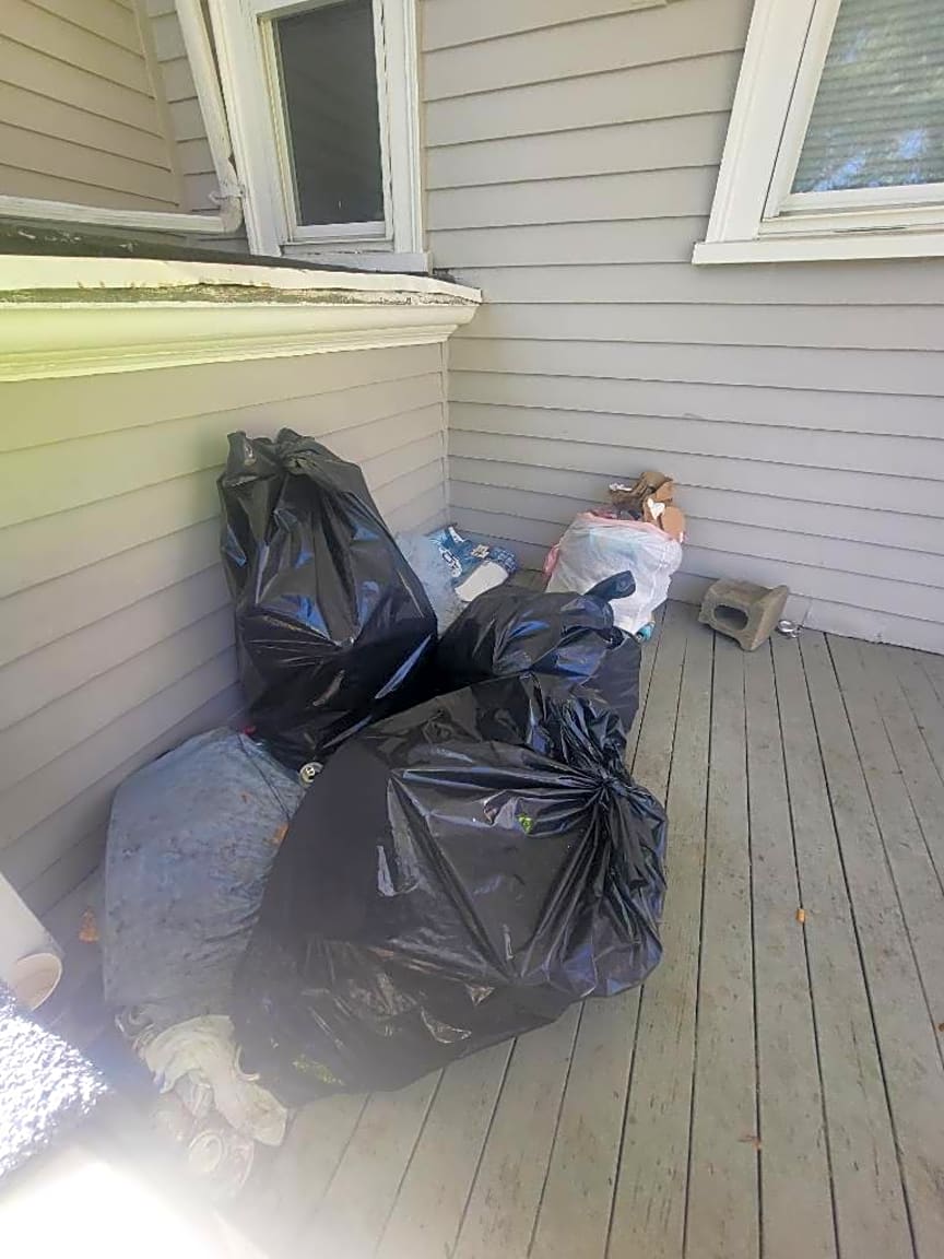 - Loose trash in between trash barrels that are stored along the Greycliff Rd side of house. Improperly stored bags of trash on porch