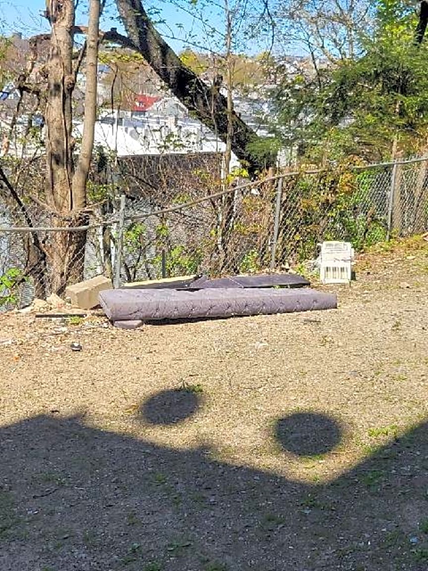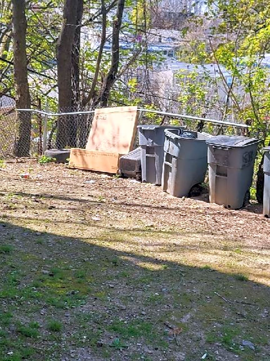 - Trash continues to be dumped illegally all the way down the hill at 60 Downer ave on a regular basis. The back yard is full of plastic, trash, great for the burrowing and nesting rats, bike tires, travel bags, window frames, bottles, cans etc