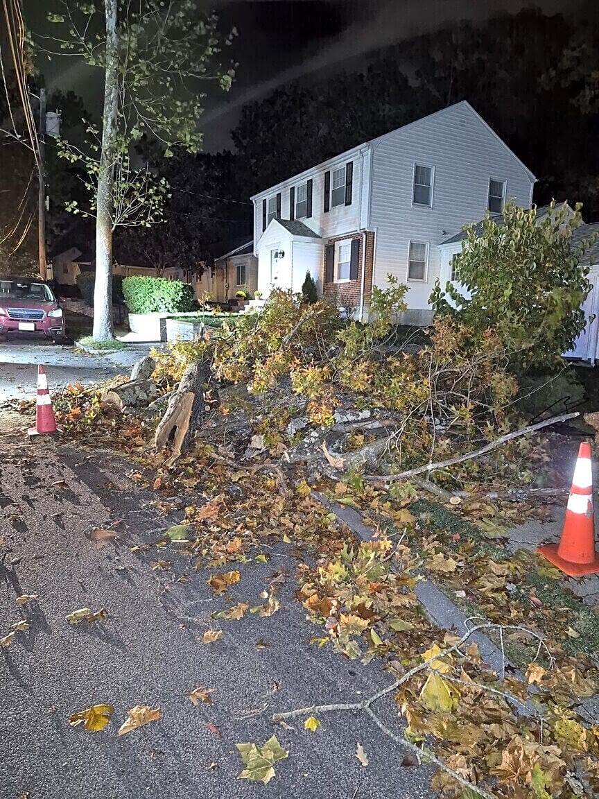Resolved. private Tree fell on city st knock down power line, cut by eversouce left on sidewalk BY JL and GR.