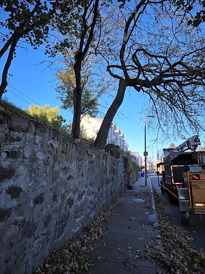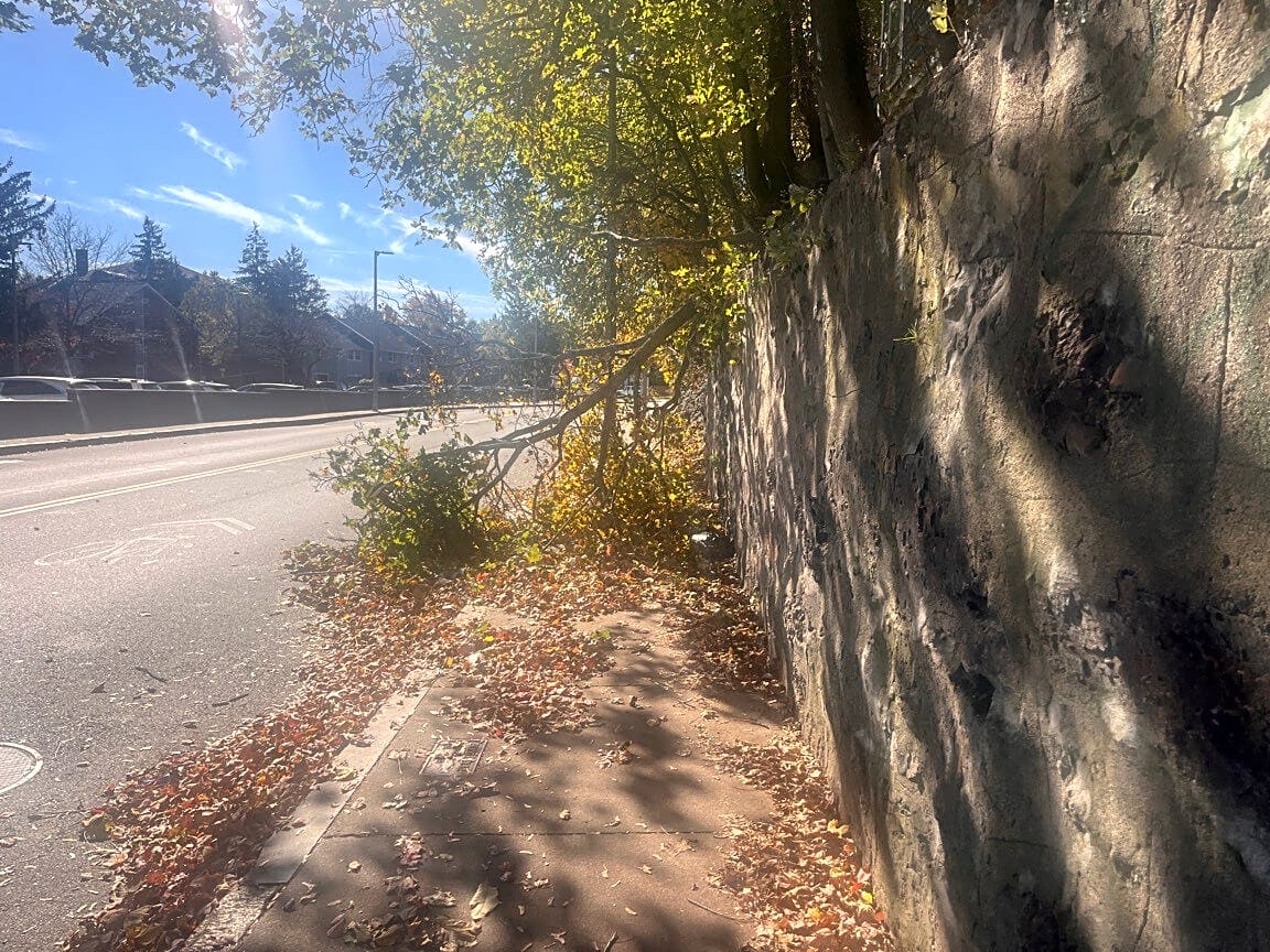 - Tree down blocking sidewalk and part of road