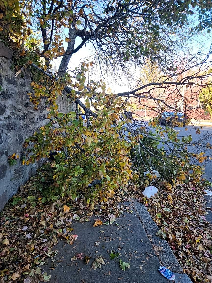 Resolved. removed branch hanging over city sidewalk BY HC and GR.