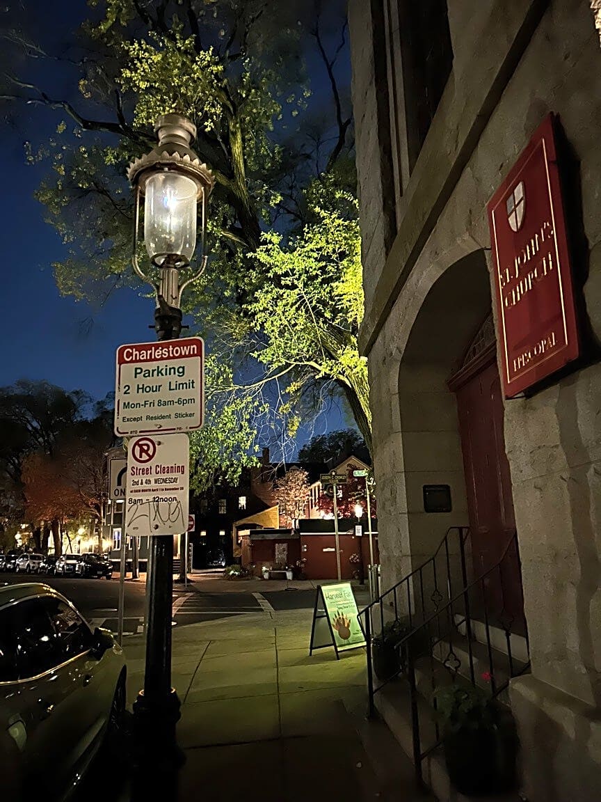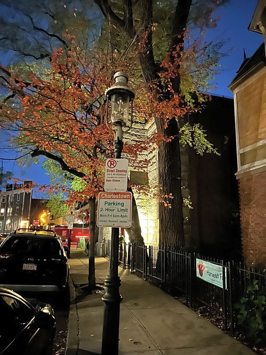 - Gas street light out in front of 27 Devens St Charlestown. Other gas lamp very very dim in front of church doors next door