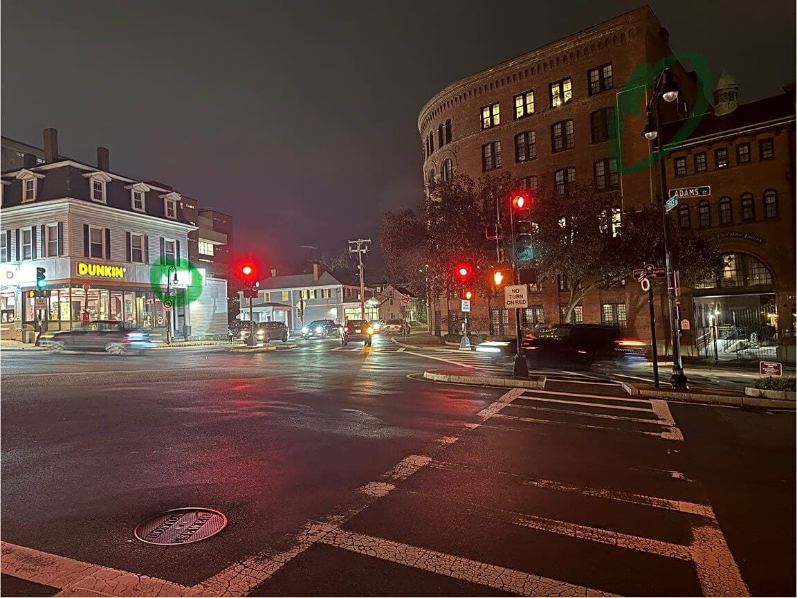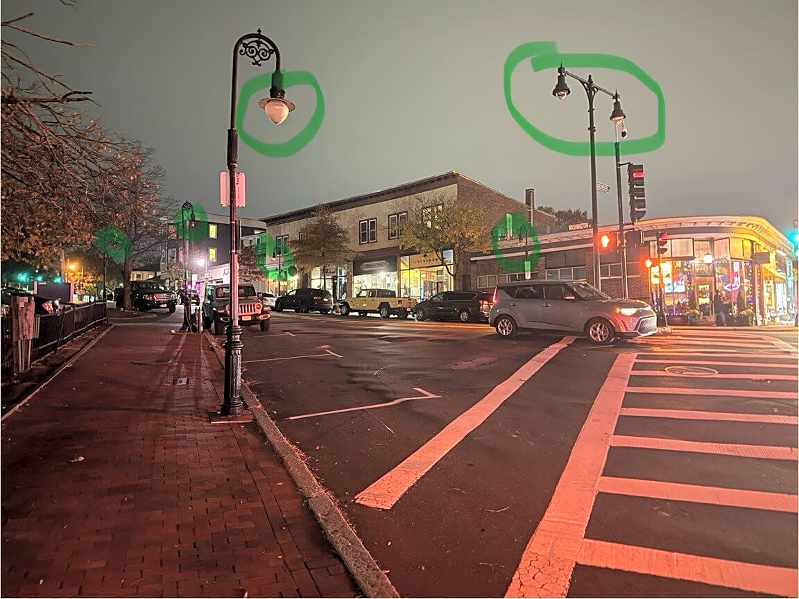 - Hello, quite a few street lights are out at the intersection and vicinity of Washington St and Dorchester Ave, Lower Mills 02124, circled in the attached photos in GREEN. About 12 lights Thanks!