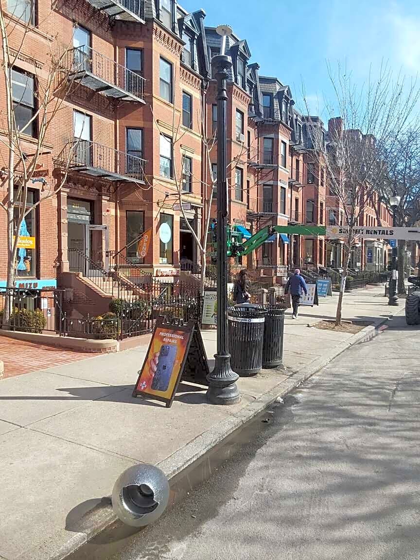 - The light post at 219 Newbury Street no long has a glass covering for the light. It was knocked off or removed and is laying in the street.