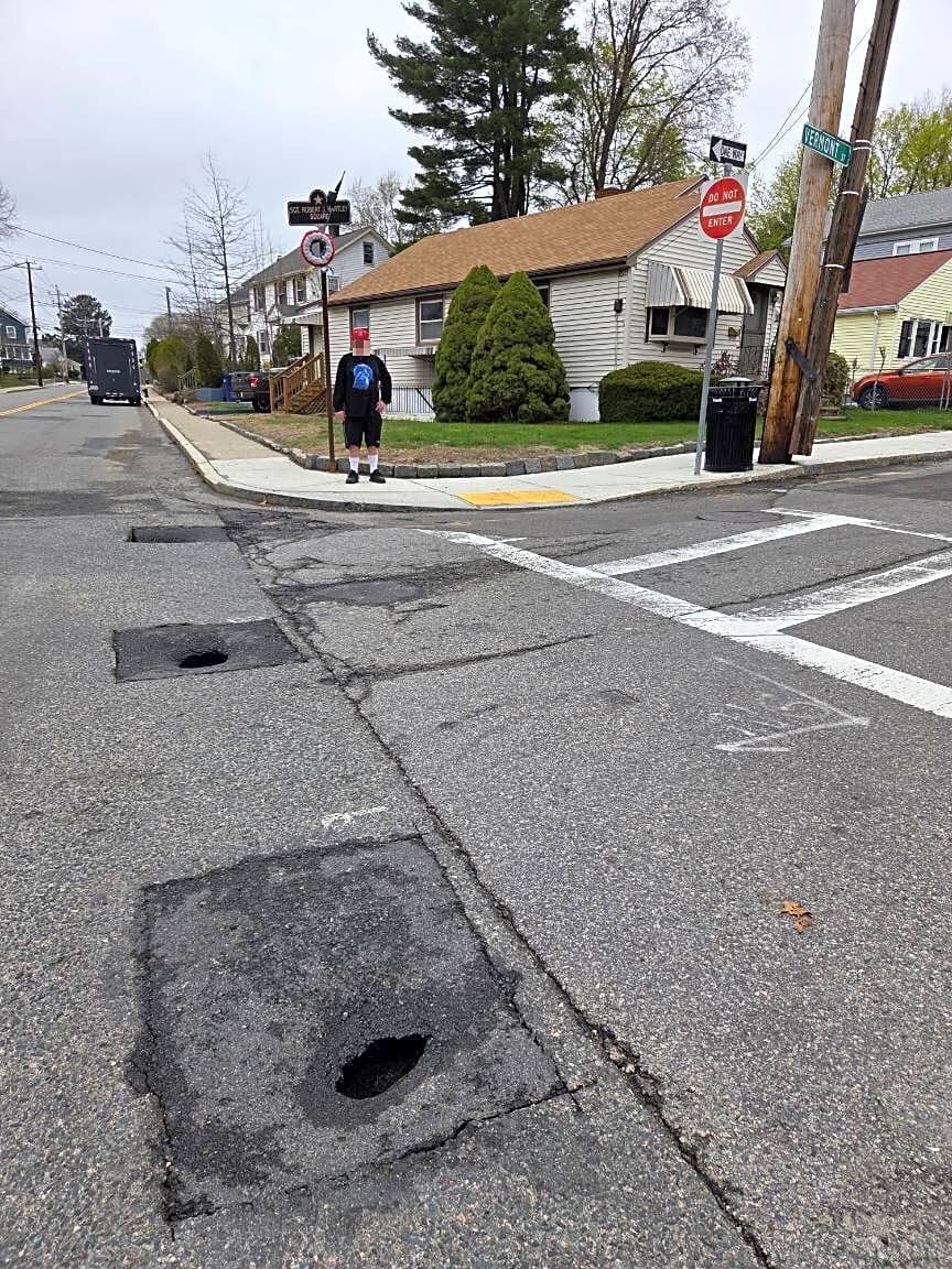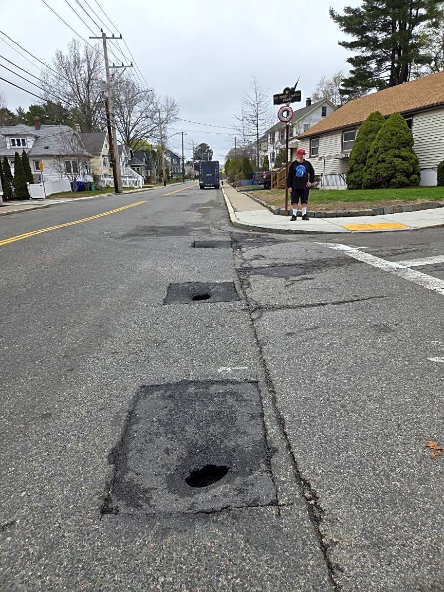 Intersection Of Vermont St And Baker St, West Roxbury, Ma3 potholes in a row appears to result of 3 patches in a row undermining.