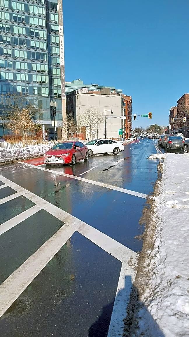 Intersection Of N Washington St And Interstate 93 N, Boston, MaIllegal U-turn on N.Washington St. Two cars made an illegal turn to avoid waiting for the turn light. Red car has Texas plates. Yellow flex poles need to be replaced to prevent this.