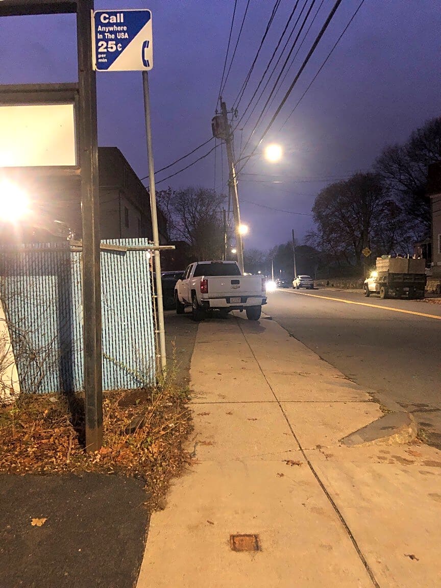 Intersection Of Prescott St And Harvard St, Charlestown, Ma2 vehicles parking overnight in Tow Zone. Location intersection of Harvard St and Prescott St. Black Nissan SUV plate 4PRF 50 and white Transit van plate 5GYK 89. Photo 5p on Sunday 11/23