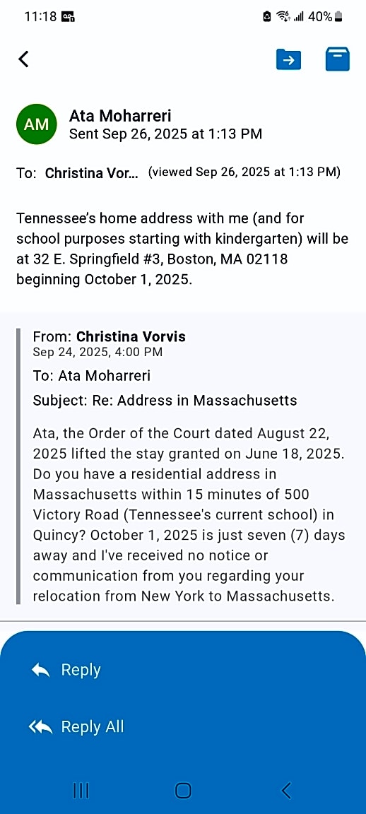 32 E Springfield St, Roxbury, Ma, 02118Ata Shariat Moharreri (DOB: 02/19/1982) moved from Bronx, New York to the South End on October 1, 2025 (see message attached). His current residence is 32 E. Springfield #3, Boston, MA 02118. He owns and operates a black 2019 Lexus SUV auto vehicle with New York License Plates # KXL-7321 (see photo). He rents a parking spot in the alley behind the building (photo taken on 11/4/25). He purchased the vehicle in New York in July 2022. Mr. Moharreri has lived in Massachusetts for over 30 days and continues operating the vehicle with out-of-state plates and driver's license. Mr. Moharreri is operating the vehicle illegally on a daily basis with our minor child (DOB: 09/12/2020). The Child was dropped off at school today in Quincy by his father at 9:46am (11/24). I am picking up our child after school and he will be in my physical care and custody and that's why I'm reporting this issue now. To protect our son from being transported in an unregistered and uninsured vehicle with a driver that does not have a valid Massachusetts Driver's License. The father is demonstrating a conscious disregard our son's financial and physical safety. Respectfully, Christina Vorvis, PhD 2001 Marina Drive, Unit 909 Quincy, MA 02171 617-939-7909
