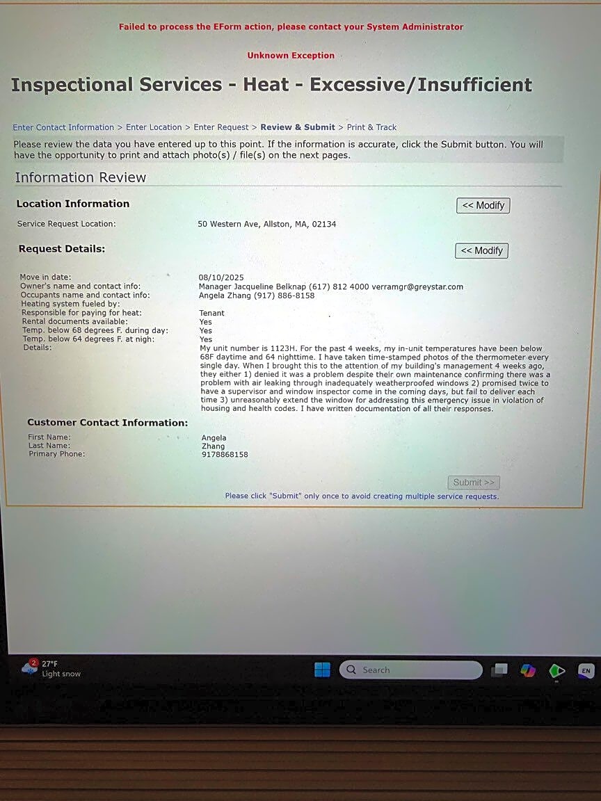 Intersection Of Hague St And Western Ave, Boston, MaI tried to submit the following report to Inspectional Services regarding insufficient heating but received an error message. I am attaching a screenshot. I live at 50 Western Ave 1123H Allston, MA 02134. For the past 4 weeks, my in-unit temperatures have been below 68F daytime and 64 nighttime. I have taken time-stamped photos of the thermometer every single day. When I brought this to the attention of my building's management 4 weeks ago, they either 1) denied it was a problem despite their own maintenance confirming there was a problem with air leaking through inadequately weatherproofed windows 2) promised twice to have a supervisor and window inspector come in the coming days, but fail to deliver each time 3) unreasonably extend the window for addressing this emergency issue in violation of housing and health codes. I have written documentation of all their communication delaying this emergency.