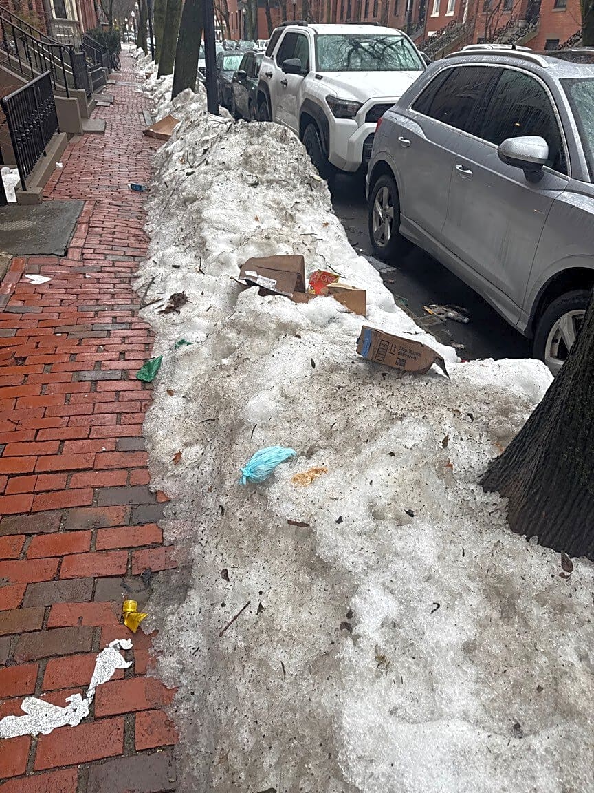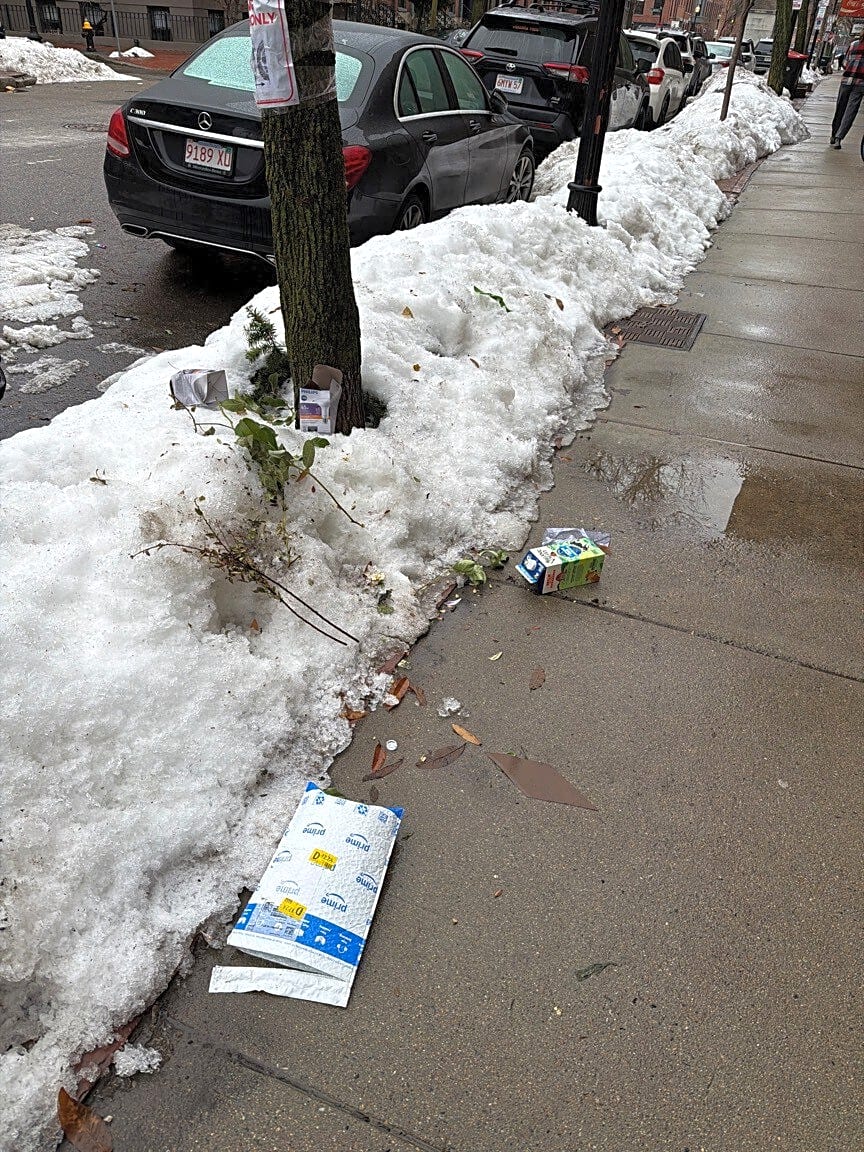 63 65 Burbank St, Boston, Ma, 02115Sofa abandoned on street. Emerging from under the snow. Allison’s loose trash along the sidewalk here 25 feet in both directions. Thanks.