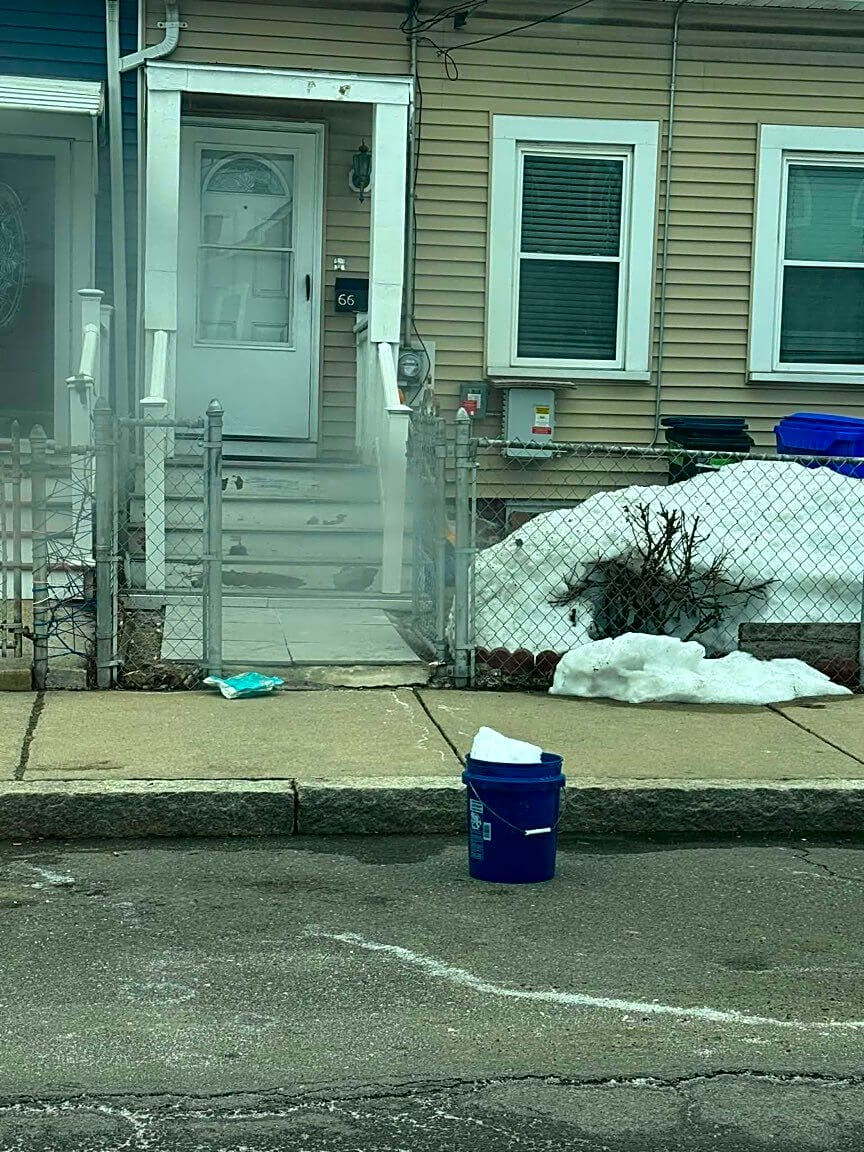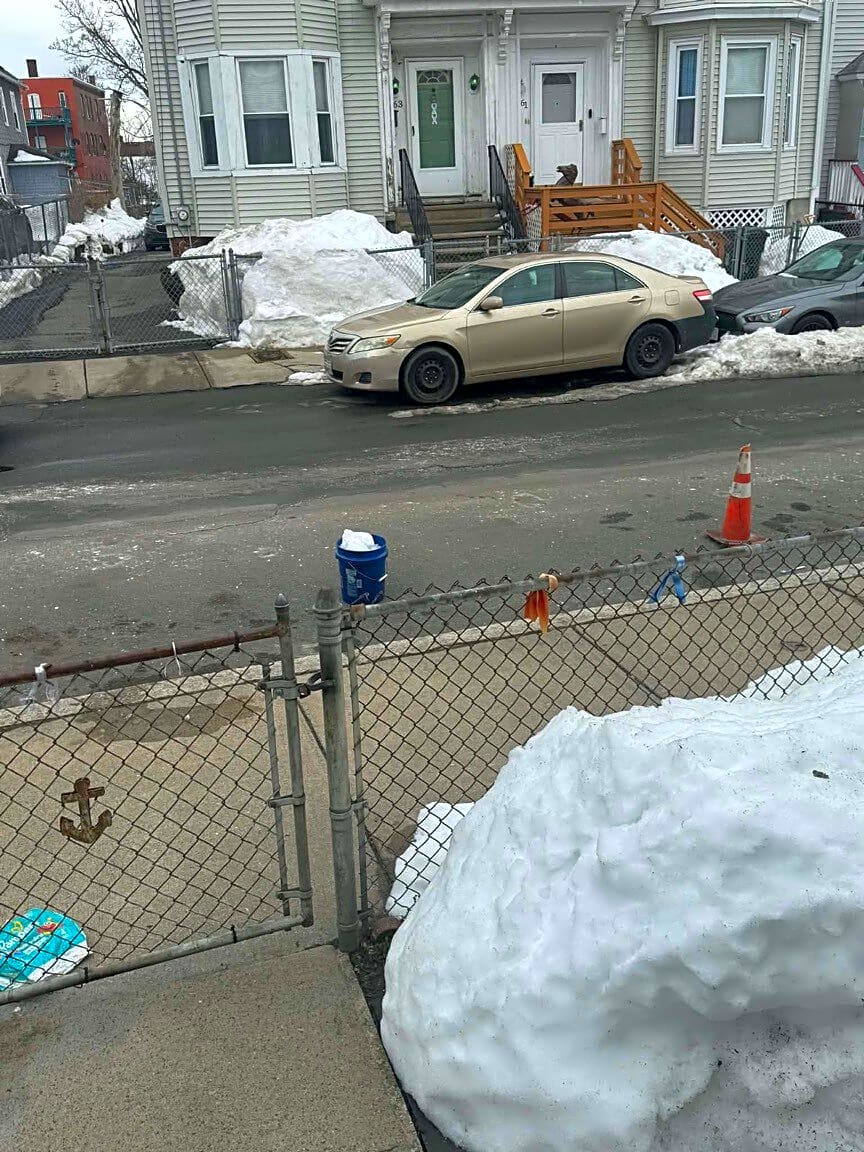 24 Rosselerin Rd, Dorchester, Ma, 02122Recycling barrel still on street and space savers blocking parking and sidewalk
