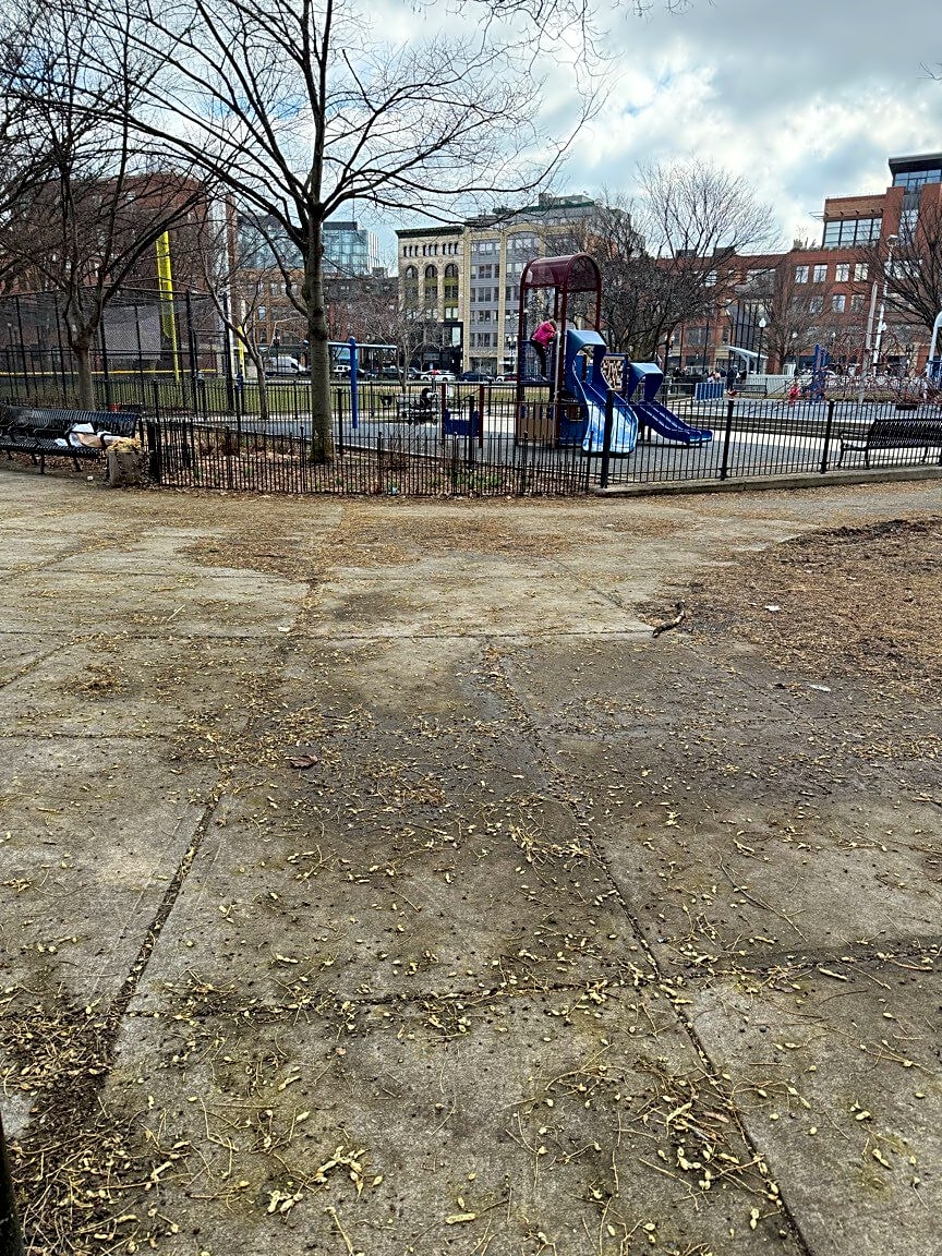 242-242A Shawmut Ave, Boston, MA 02118Tree debris is covering the sidewalk and entrance to Peter’s Park, making the walking surface slippery.