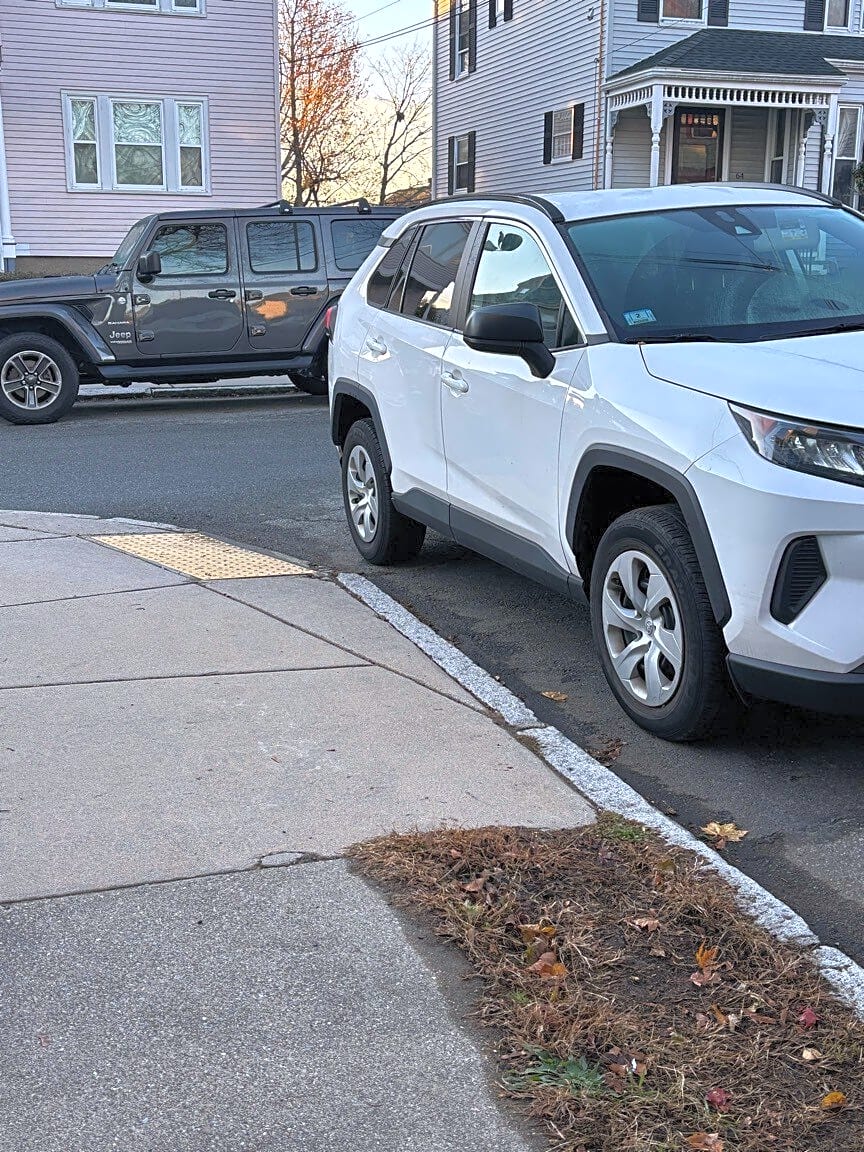 Intersection Of Blackinton St And Ashley St, East Boston, MaTruck parked blocking view of crosswalk for kids crossing to go to school, and dangerous for cars trying to turn. They have to edge out past the crosswalk to see if pedestrians are coming.