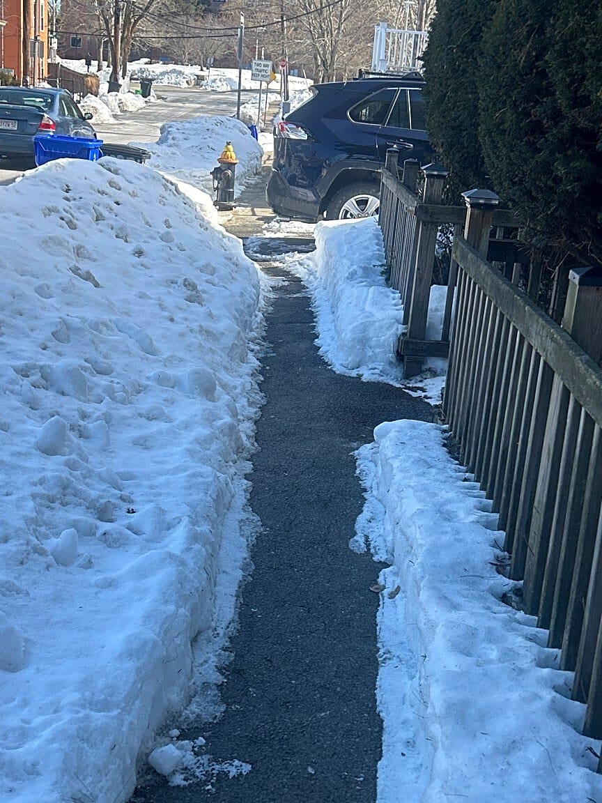 85 Mc Bride St, Jamaica Plain, Ma, 02130Can’t get cart by. Car at 95 McBride JP is blocking sidewalk everyday. People have to walk on Street. Not shoveled to legally pass.