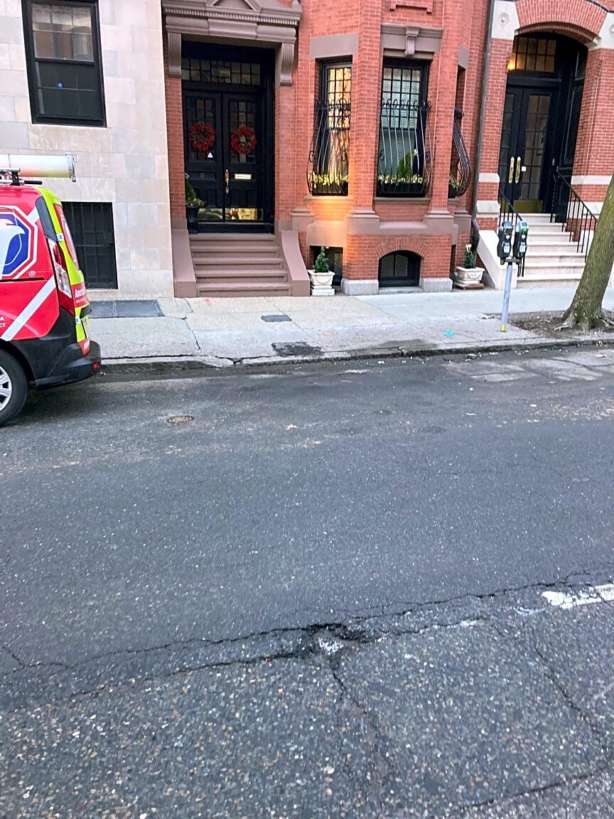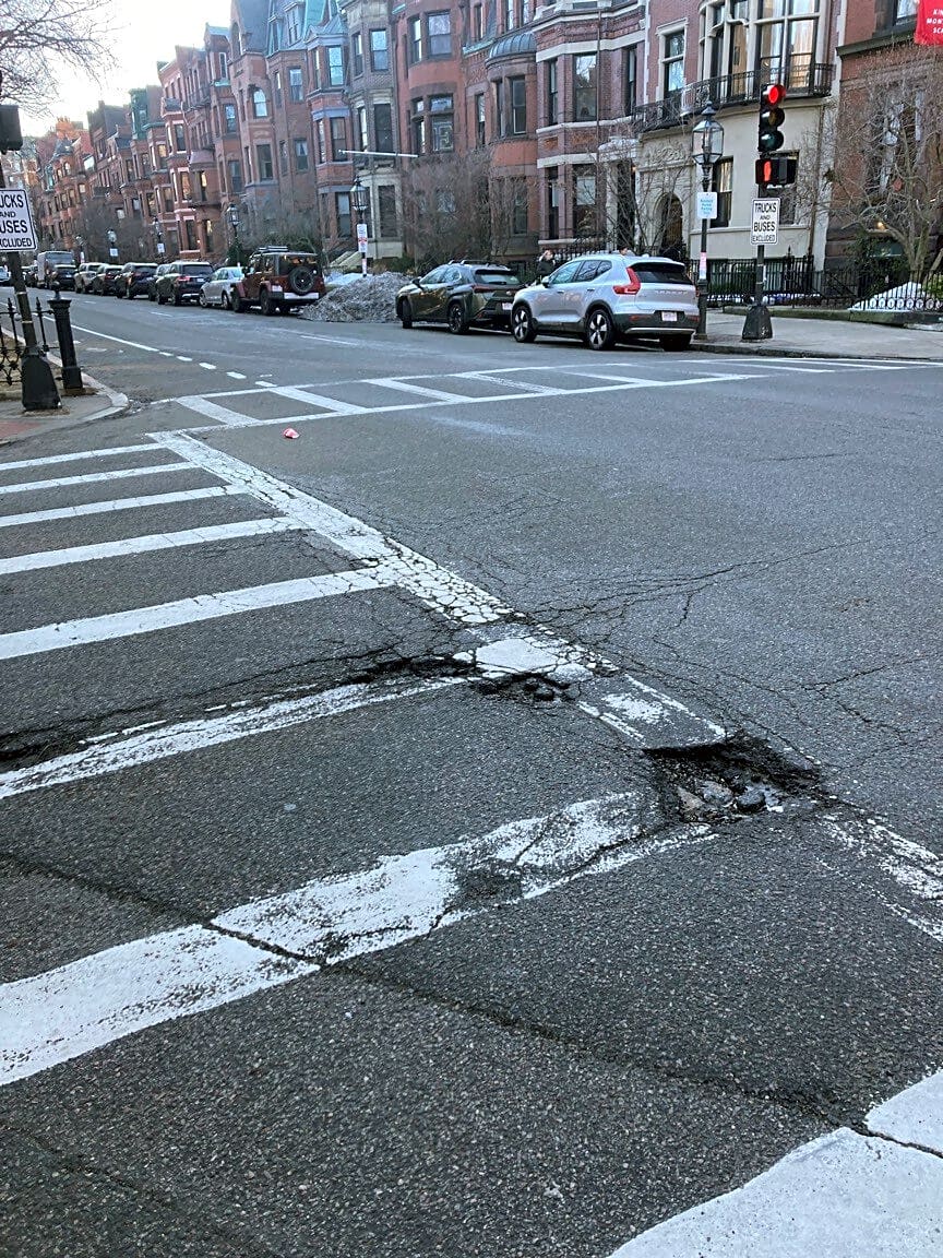 Intersection Of Fairfield St And Commonwealth Ave, Boston, Ma4 potholes in crosswalk at mall at comm and Fairfield
