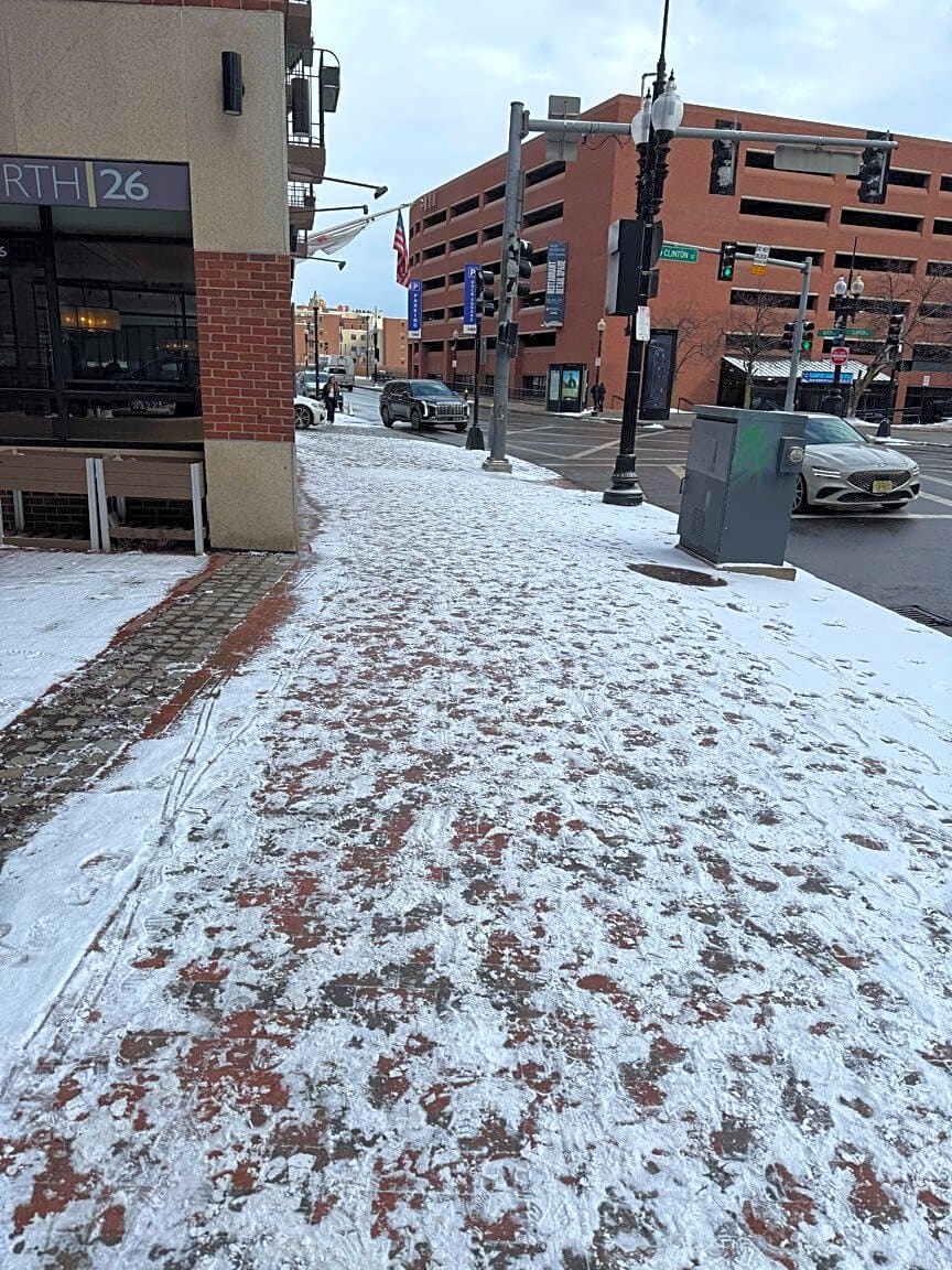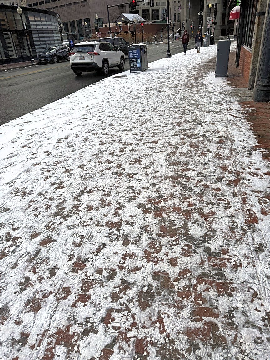 Intersection Of Clinton St And North St, Boston, MaSnow not cleared. Sidewalk very slippery