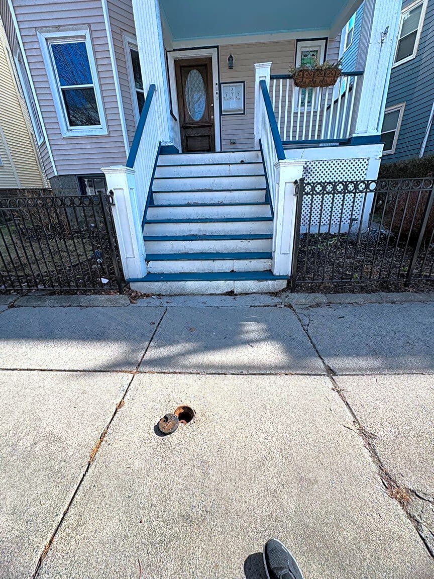 17 Saint Marks Rd, Dorchester, Ma, 02124The water line cover in the sidewalk came off and no longer fits and stays in place due to frost heaves. It’s a safety hazard having a hole this big in the middle of the sidewalk.