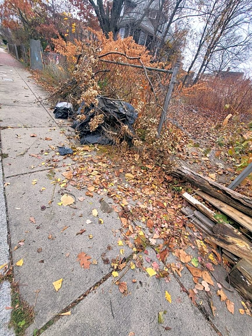 133 Ruthven St, Dorchester, Ma, 02121wood, trash, and branches dumped in front of the address |