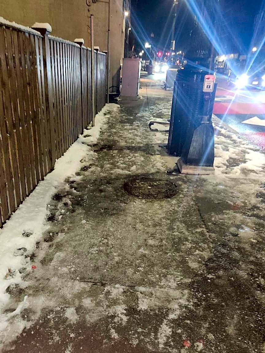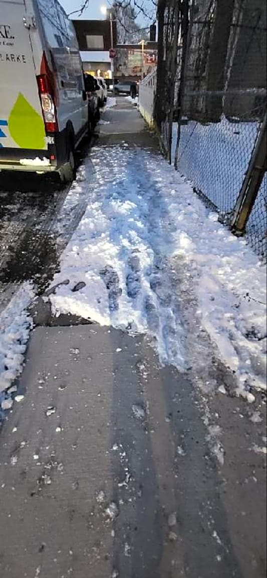 CLOSED #101006451458Resolved. Violation was issued for failure to clear sidewalk.