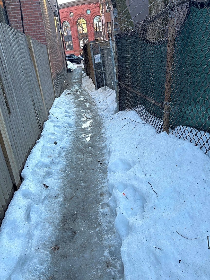 39 South St, Jamaica Plain, Ma, 02130Icy and poorly shoveled sidewalks behind the apartment building at Bardwell and South St.