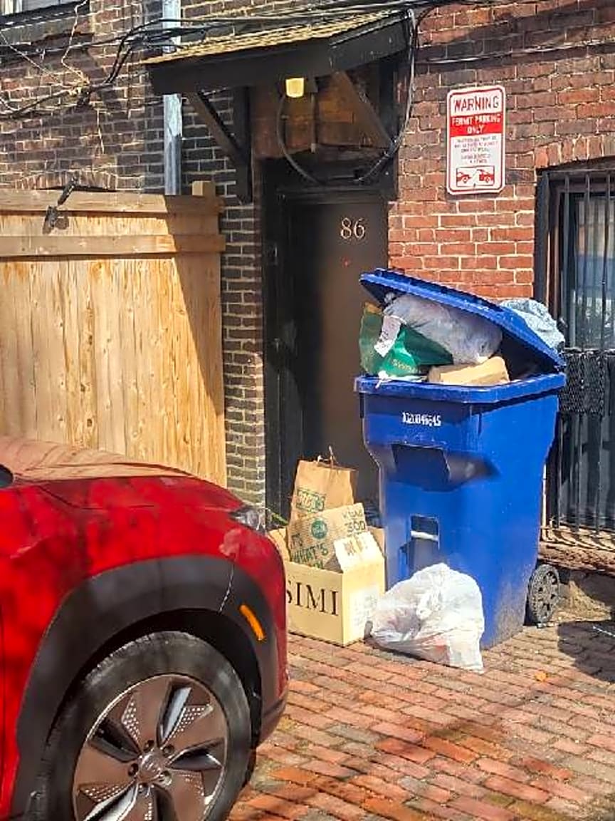 Intersection Of Public Alley No. 301 And Mount Vernon Sq, Boston, MaTrash overflowing and attracting rats, bugs, smells.Also blocking the door to building. FINDING THE ADDRESS: Address is 86 Charles Street, but the trash bins are located in the BACK of the building on Mt Vernon Sq in Public Alley 301, in between 6 Mt Vernon Sq and 10 Mt Vernon Sq. You will see the trash cans and a black door with "86" on it. NOTE: New owners took over in November. This building is now owned by CEIRE LLC at 101 Federal St, Unit 1900, 02110. Owners are Christopher Christian and Kristen Christian. it is managed by Suffolk Property Management. Owner is John Michaels, 90 Canal St/Boston . __ ISSUE: landlord has been issued an official document by City of Boston Inspectors Office and was told to remove trash cans away from the building, which they have not.
