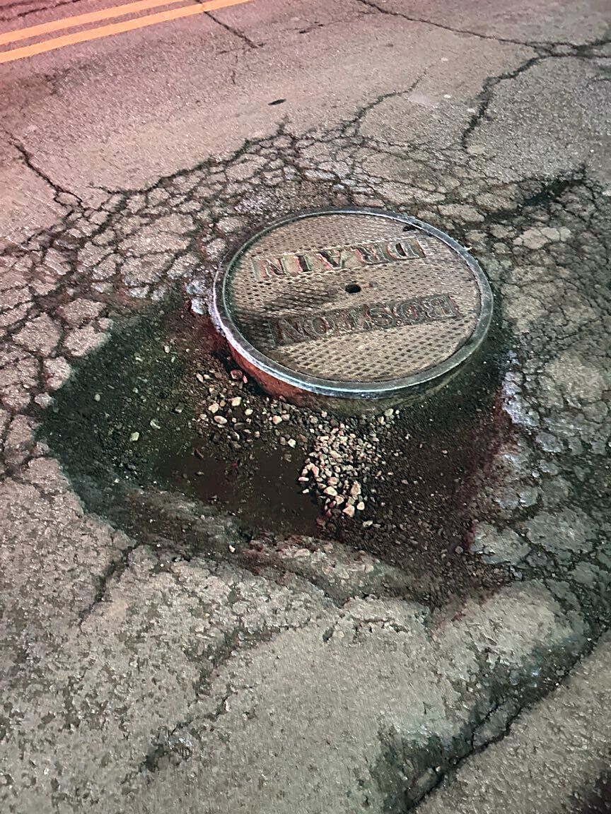 3 Nay St, East Boston, Ma, 02128Deep hole. Around 5-7in. There’s gonna be a claim with someone’s damaged car
