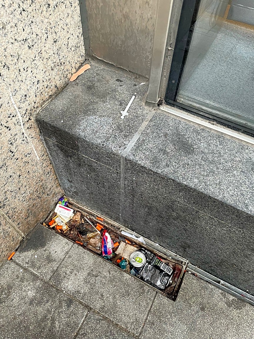 Intersection Of Blagden St And Exeter St, Boston, MaNeedle, drug paraphernalia behind Boston public library. Can be found along the windows of the library that face Exeter Street and in the crevice between the wall of the library and we are the sidewalk meets the wall