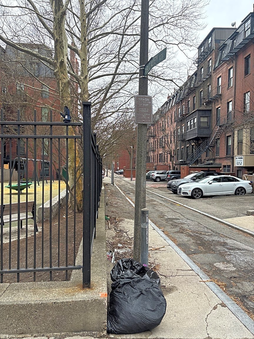 Intersection Of Public Alley No. 419 And Public Alley No. 420 And Clarendon St, Boston, MaTrash bags, litter, branches, old rat trap behind Playground at intersection of Clarendon Street and Public Alley 424..