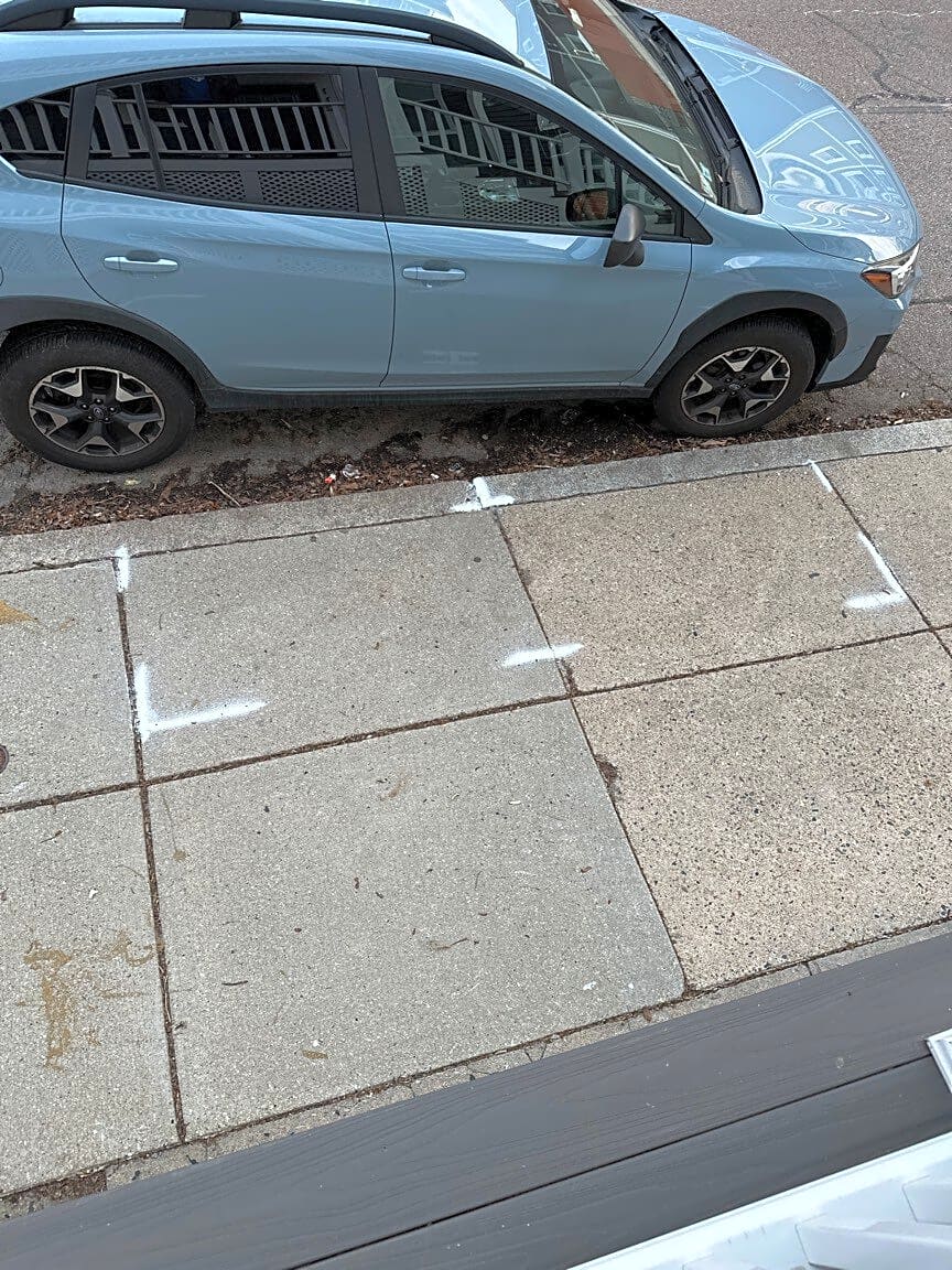 112 Sawyer Ave, Dorchester, Ma, 02125What does this mean? These white markings on the sidewalk.